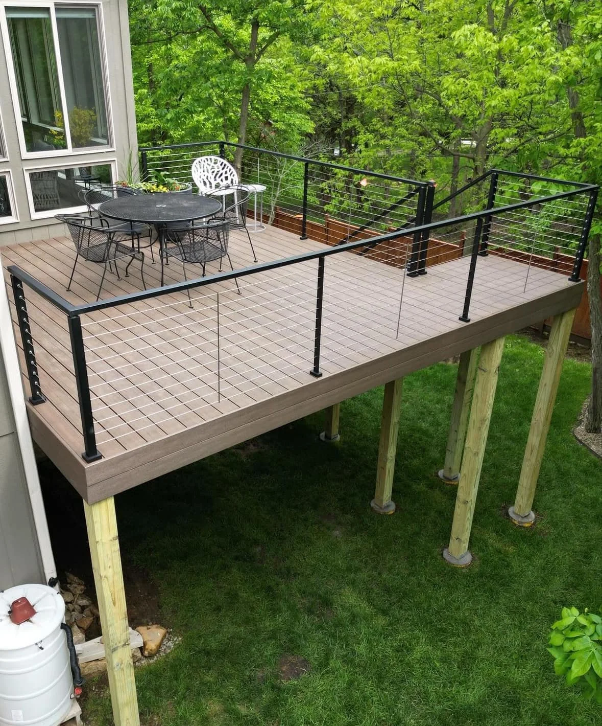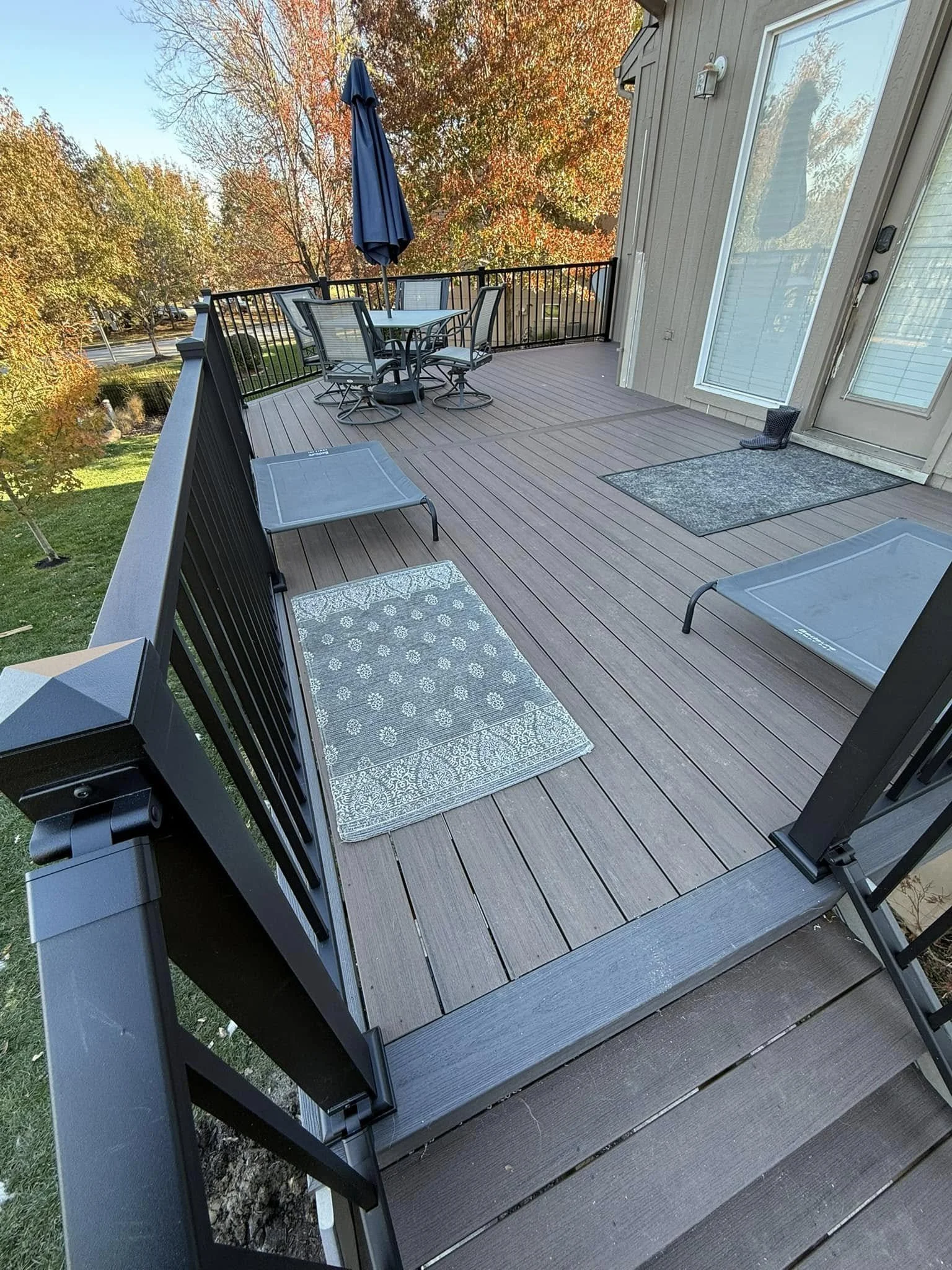 Newly built wooden deck with black metal railing, outdoor dining table with six chairs, and surrounding green trees.