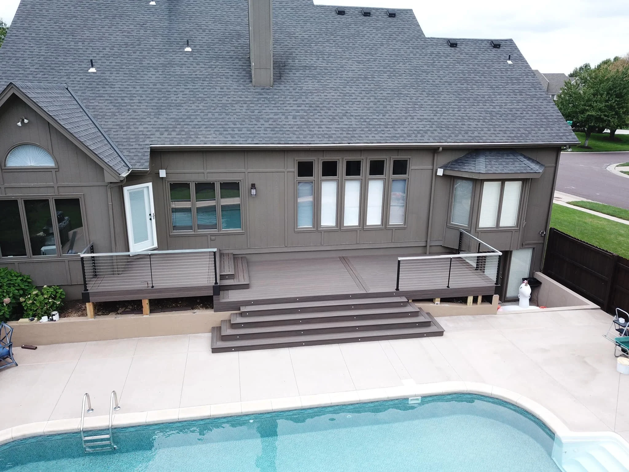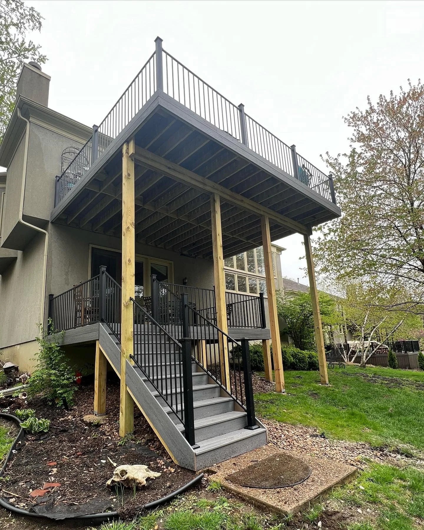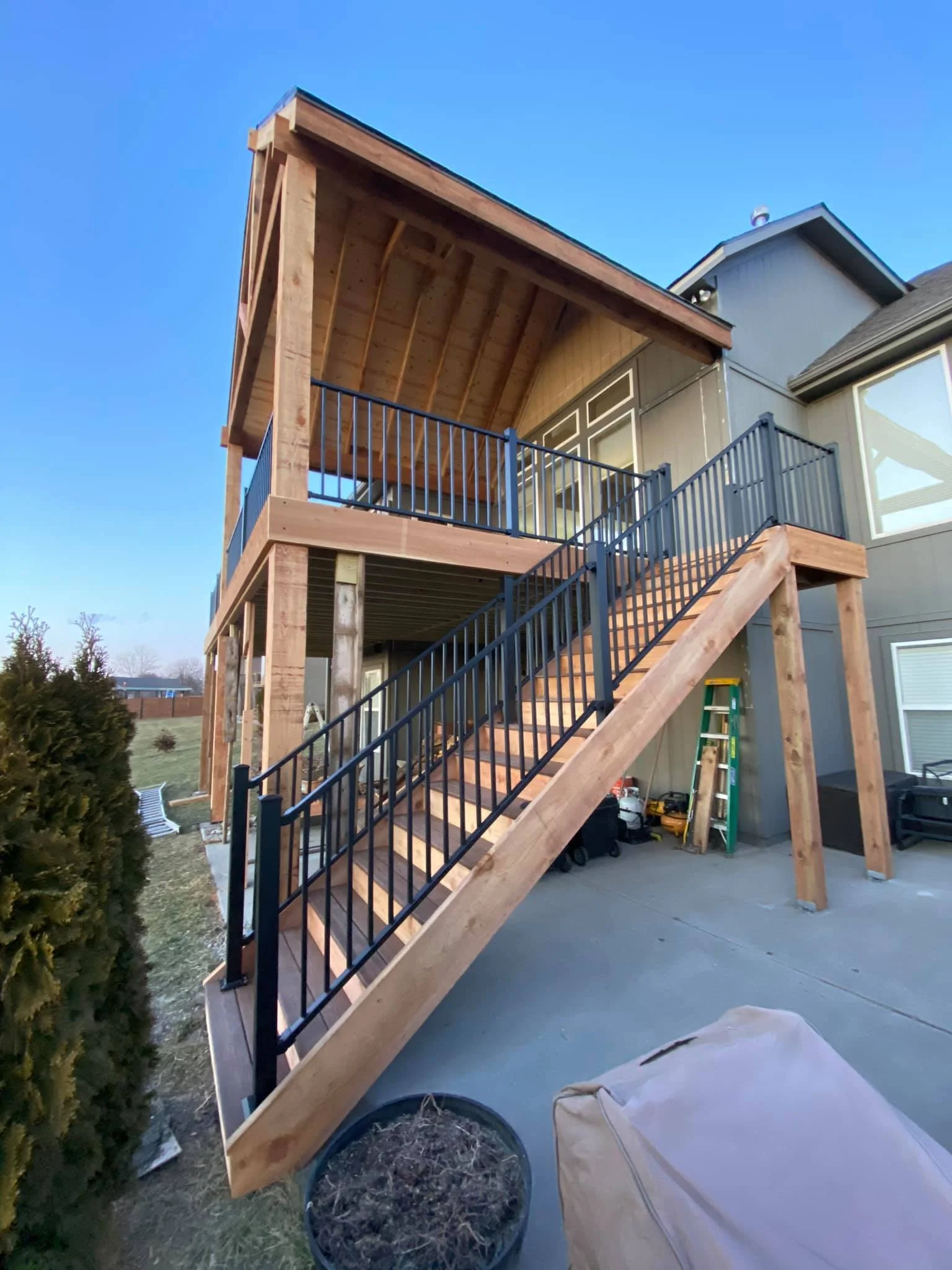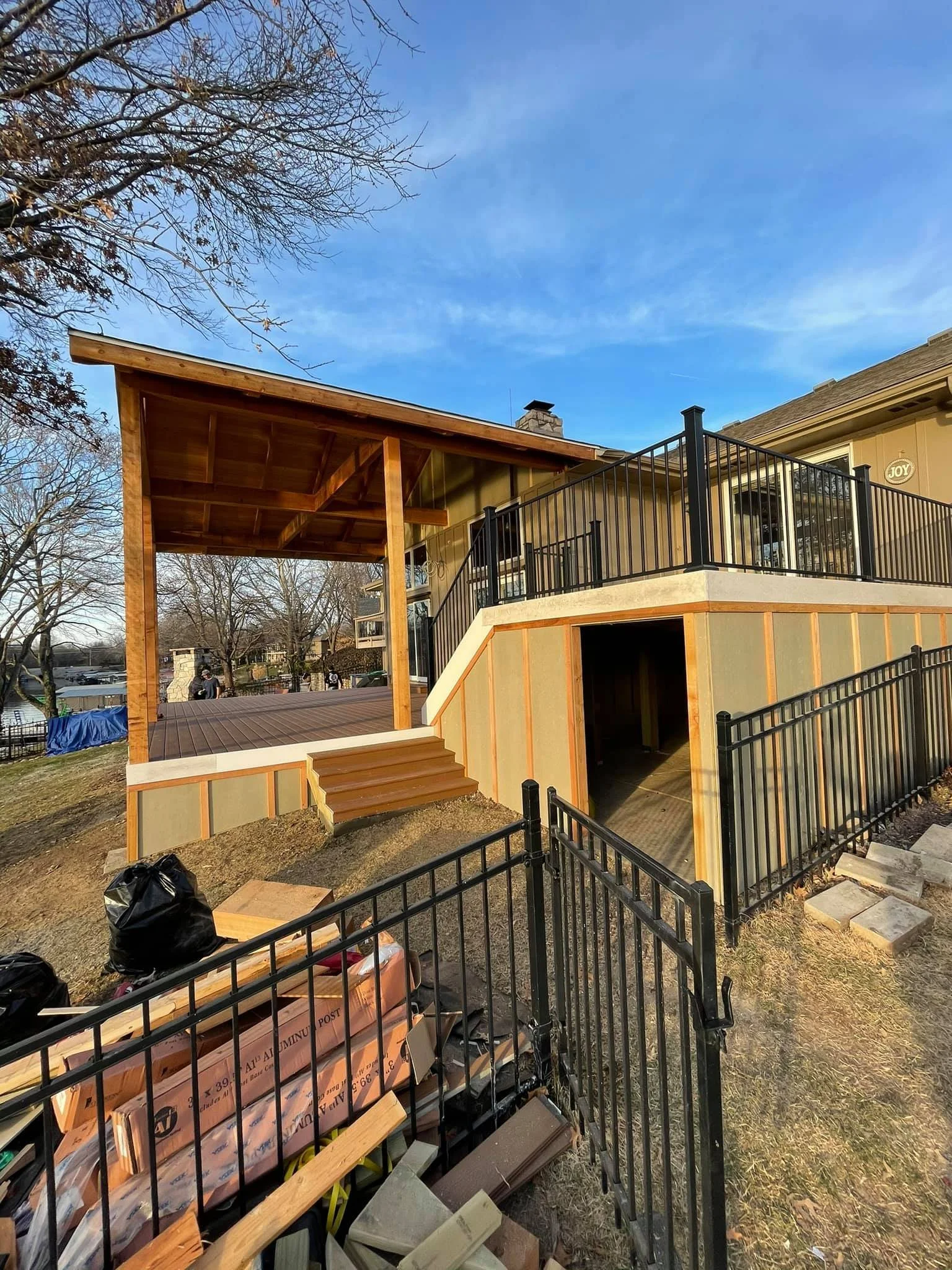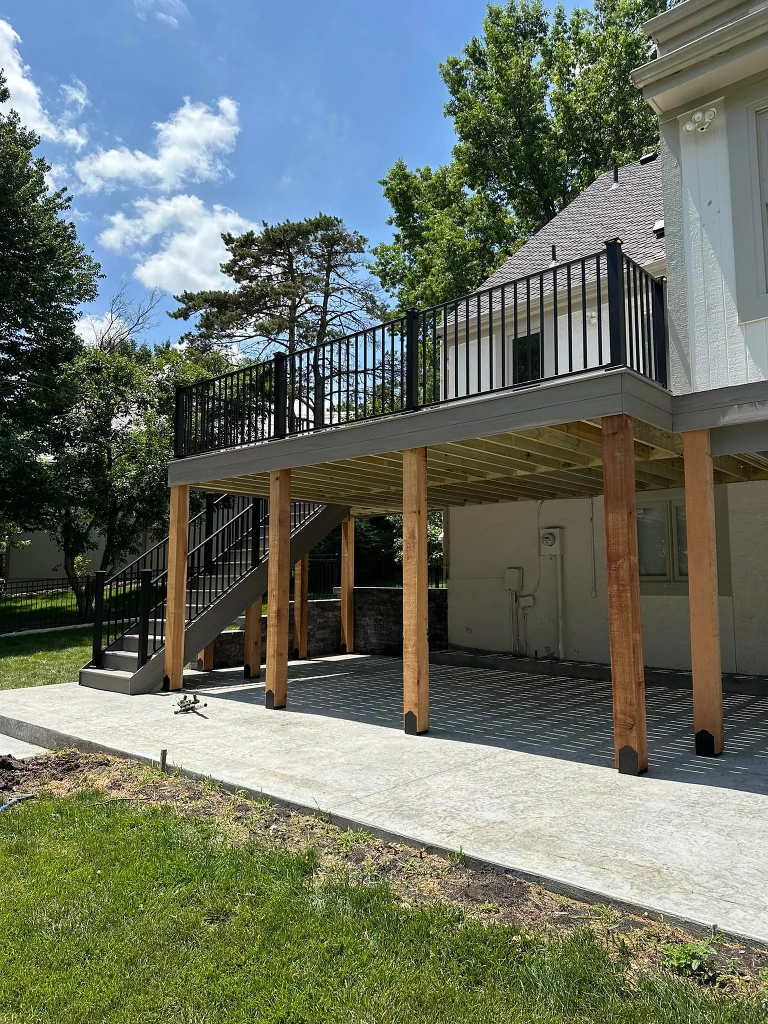 Construction of a new wooden deck with black metal railing on a backyard patio, with stairs leading down, under a partly sunny sky with some clouds.  Dekco Construction Johnson County, Kansas