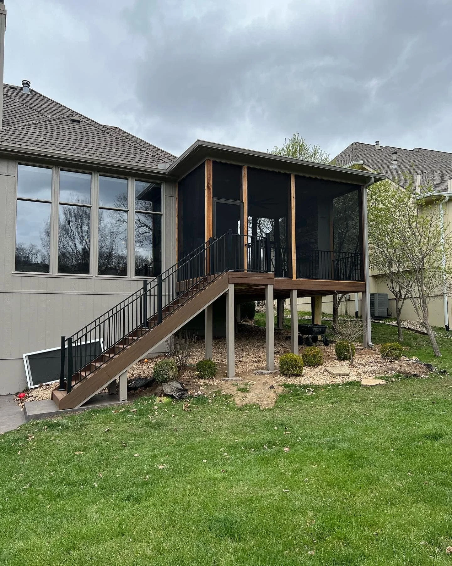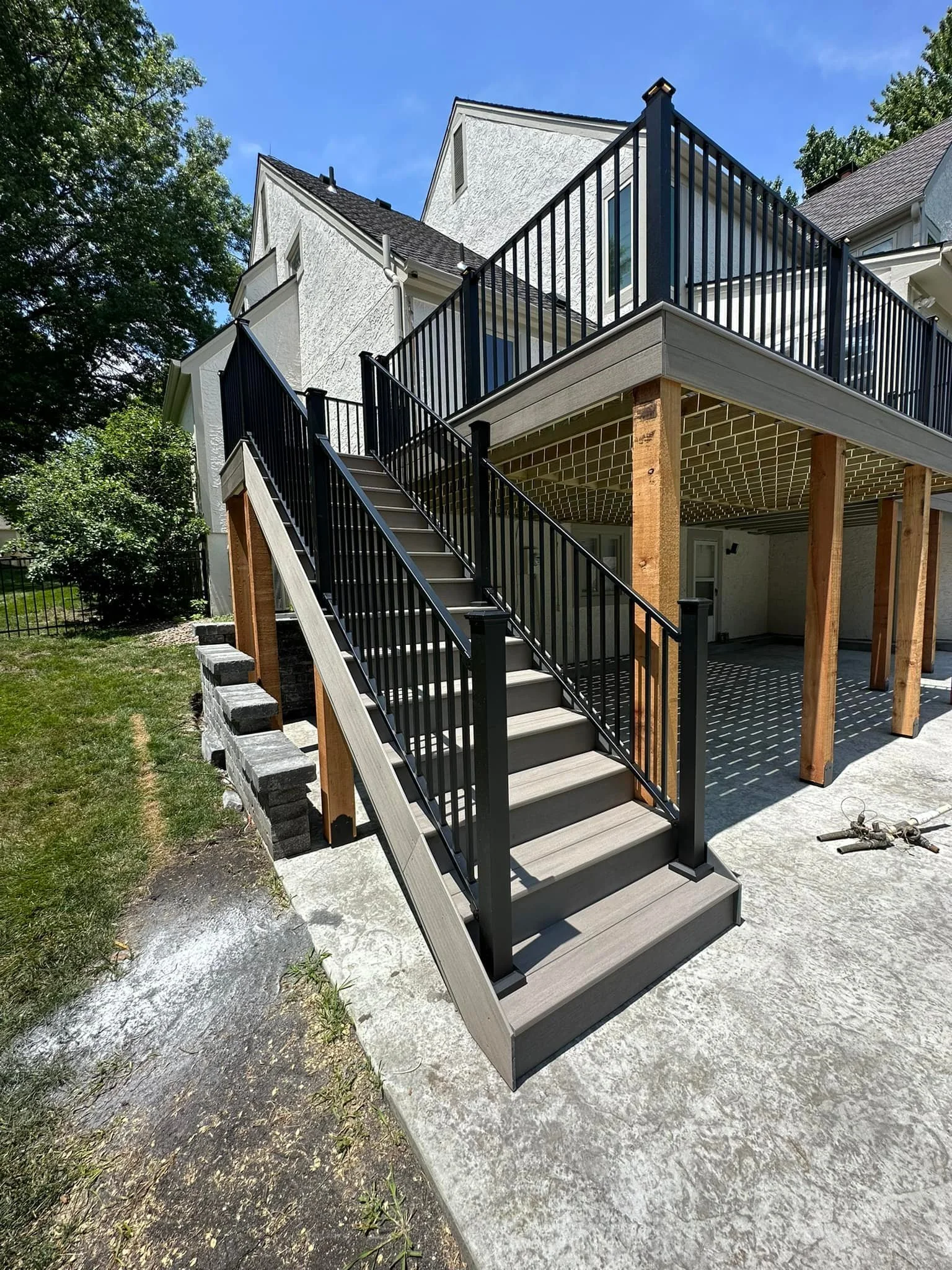 Two-story house with a white porch and outdoor stairs, surrounded by a black metal fence and a grassy yard under a clear blue sky.  Dekco Construction Johnson County, Kansas