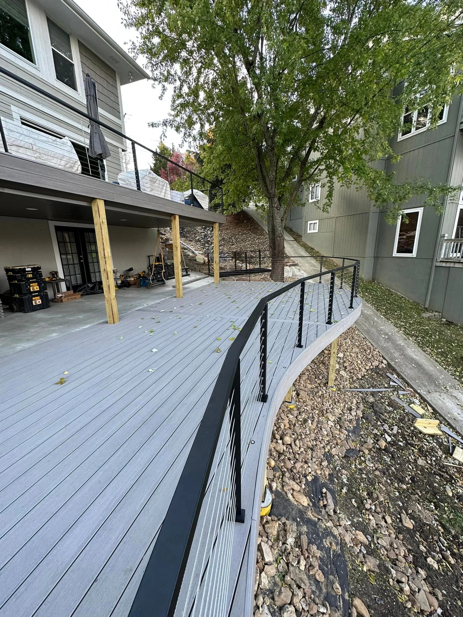 Newly constructed gray wooden deck with black metal railings, attached to a house with two levels, outdoor furniture covered with white tarps on upper level, tools and equipment stored underneath, large green tree nearby, surrounding landscaped area