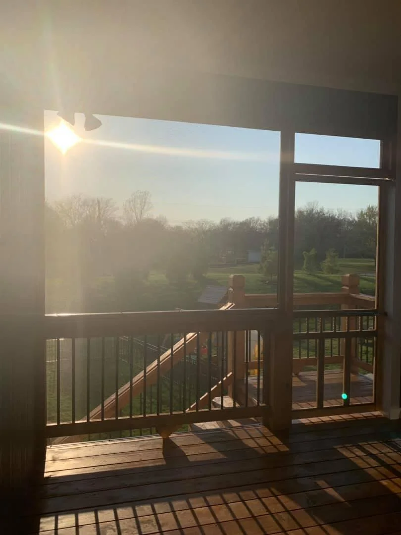 Sunlight streaming through a large window onto a wooden balcony or deck with a railing, overlooking a backyard with trees and grass on a clear day.