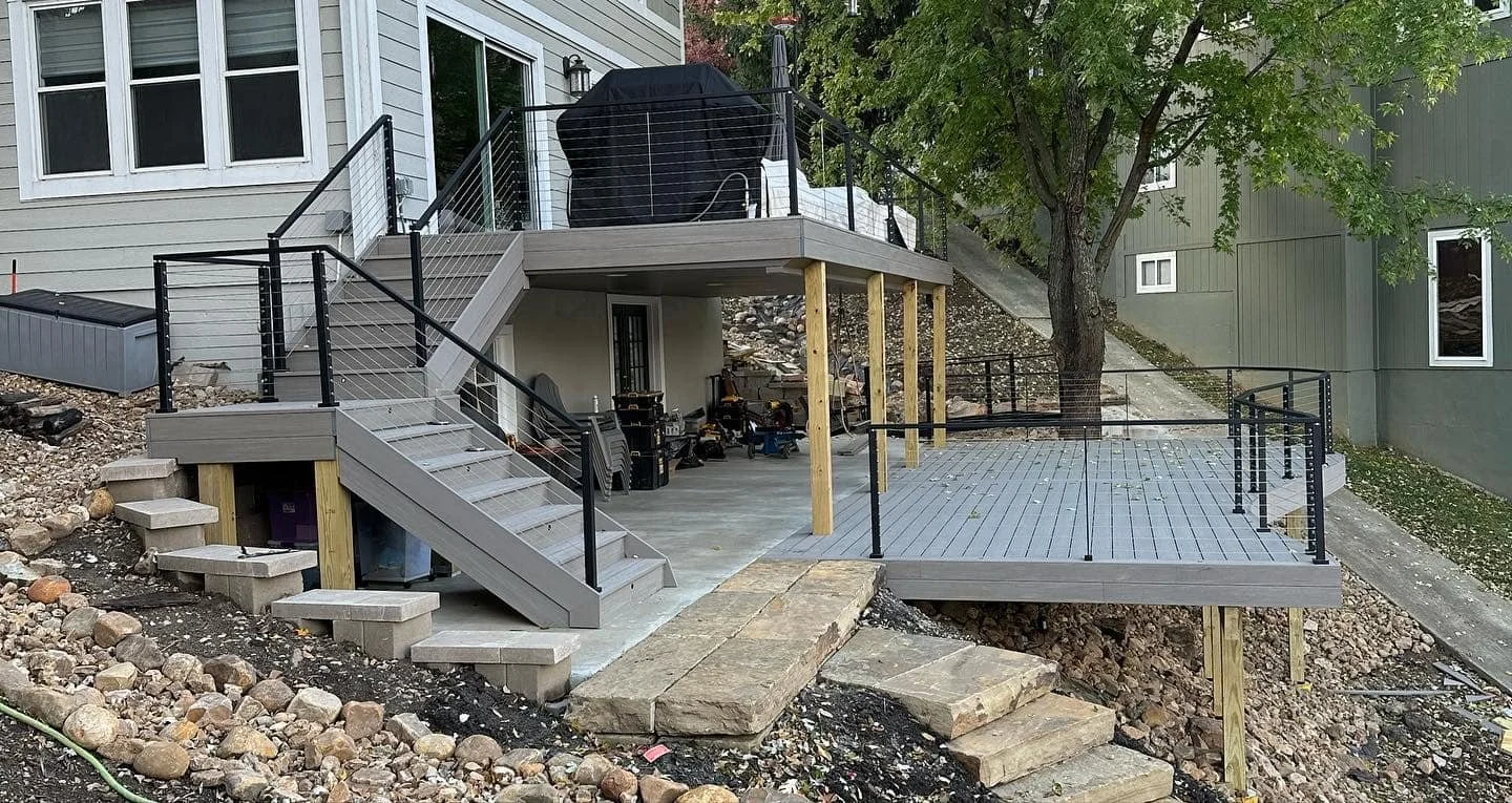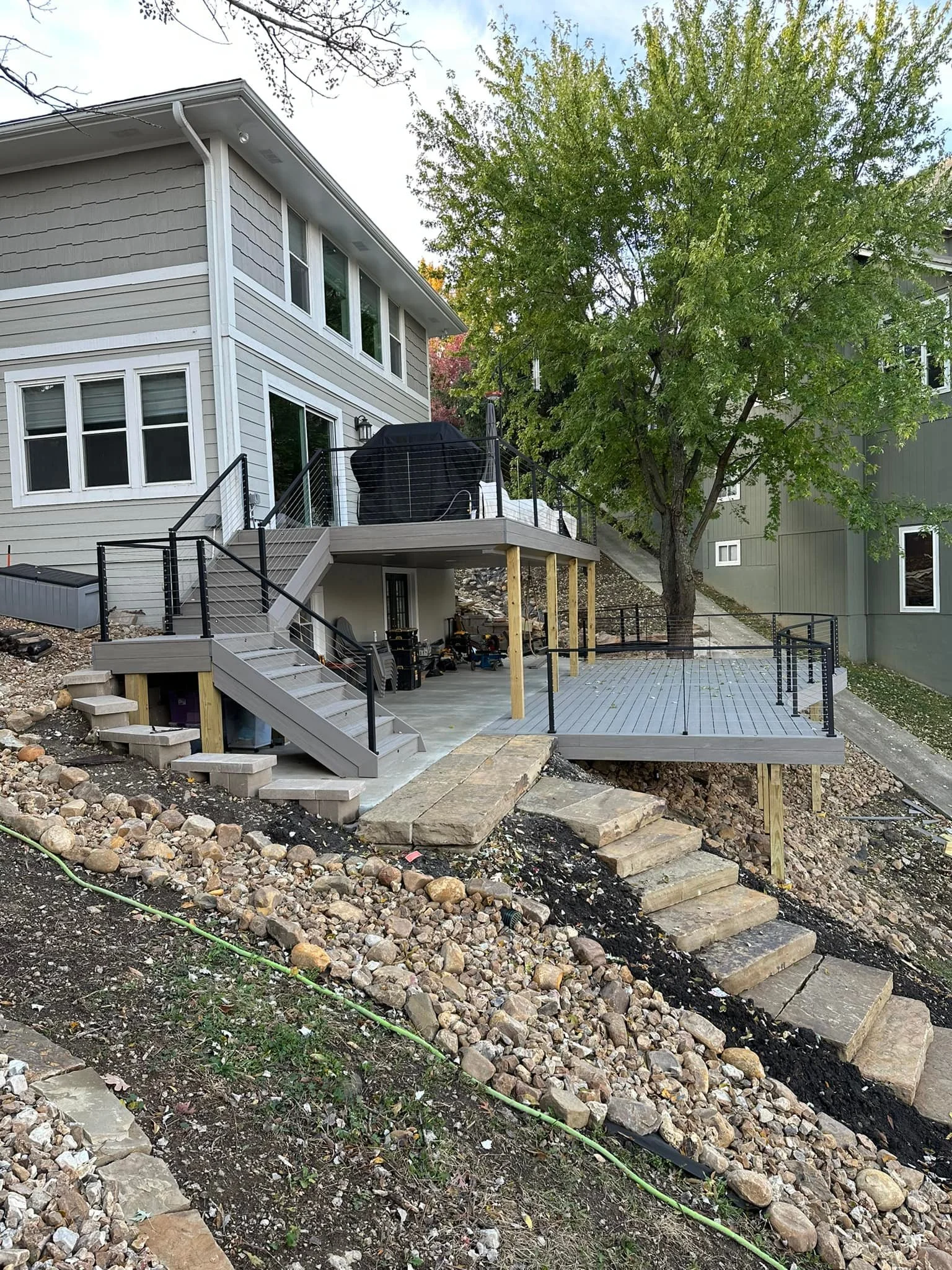 Newly constructed multi-level backyard deck with stairs, black metal railings, concrete patio, and surrounded by rocks and a house with grey siding.