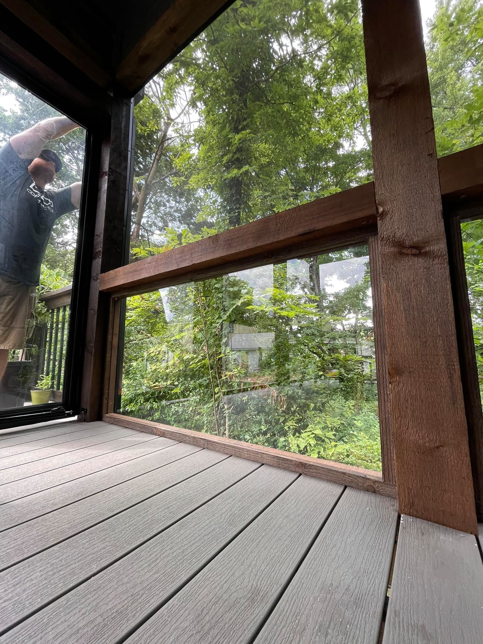 Indoor view of a wooden balcony with a glass window overlooking a lush green garden, with a person partially visible outside on the balcony.  Dekco Construction Johnson County, Kansas