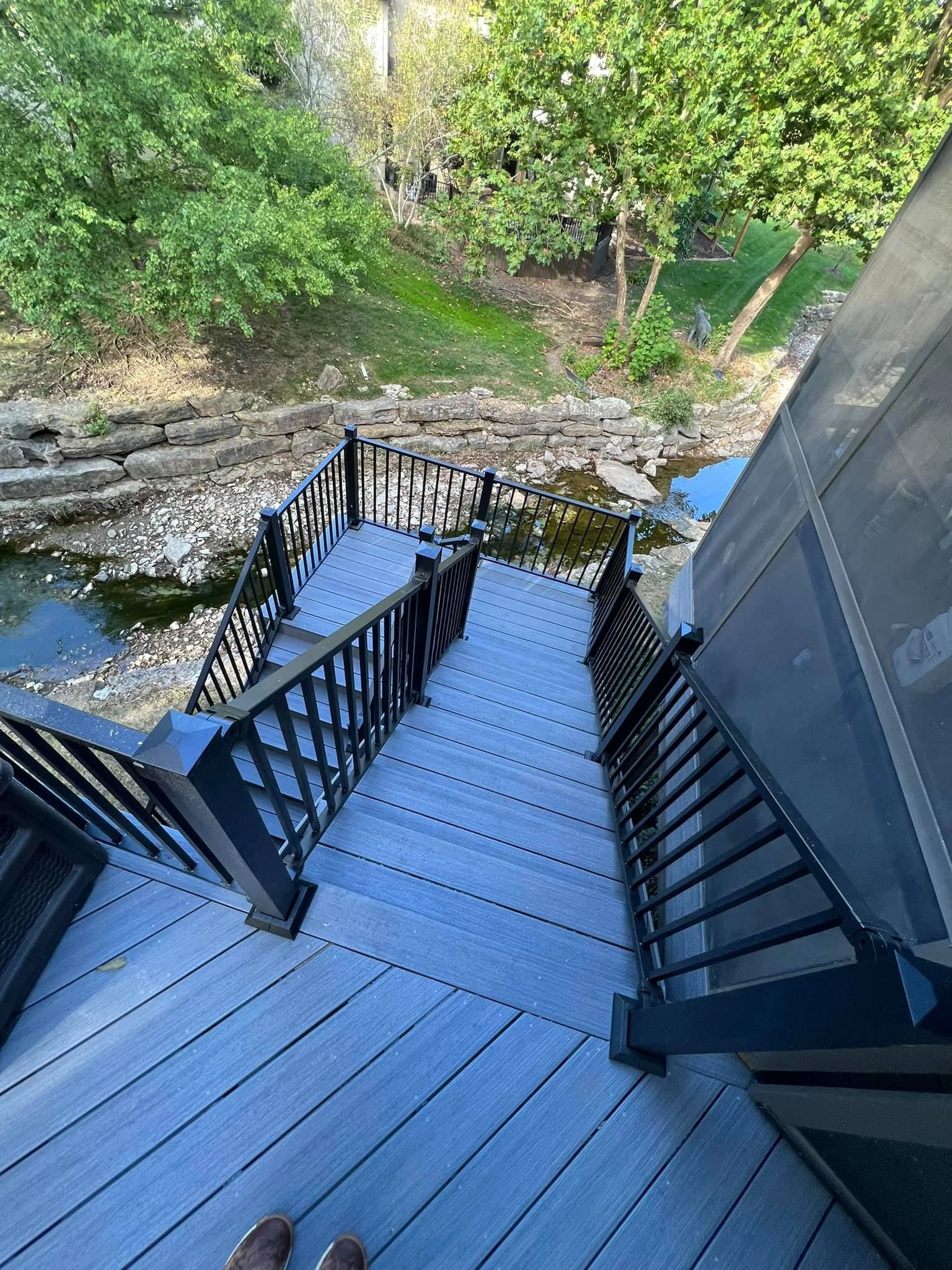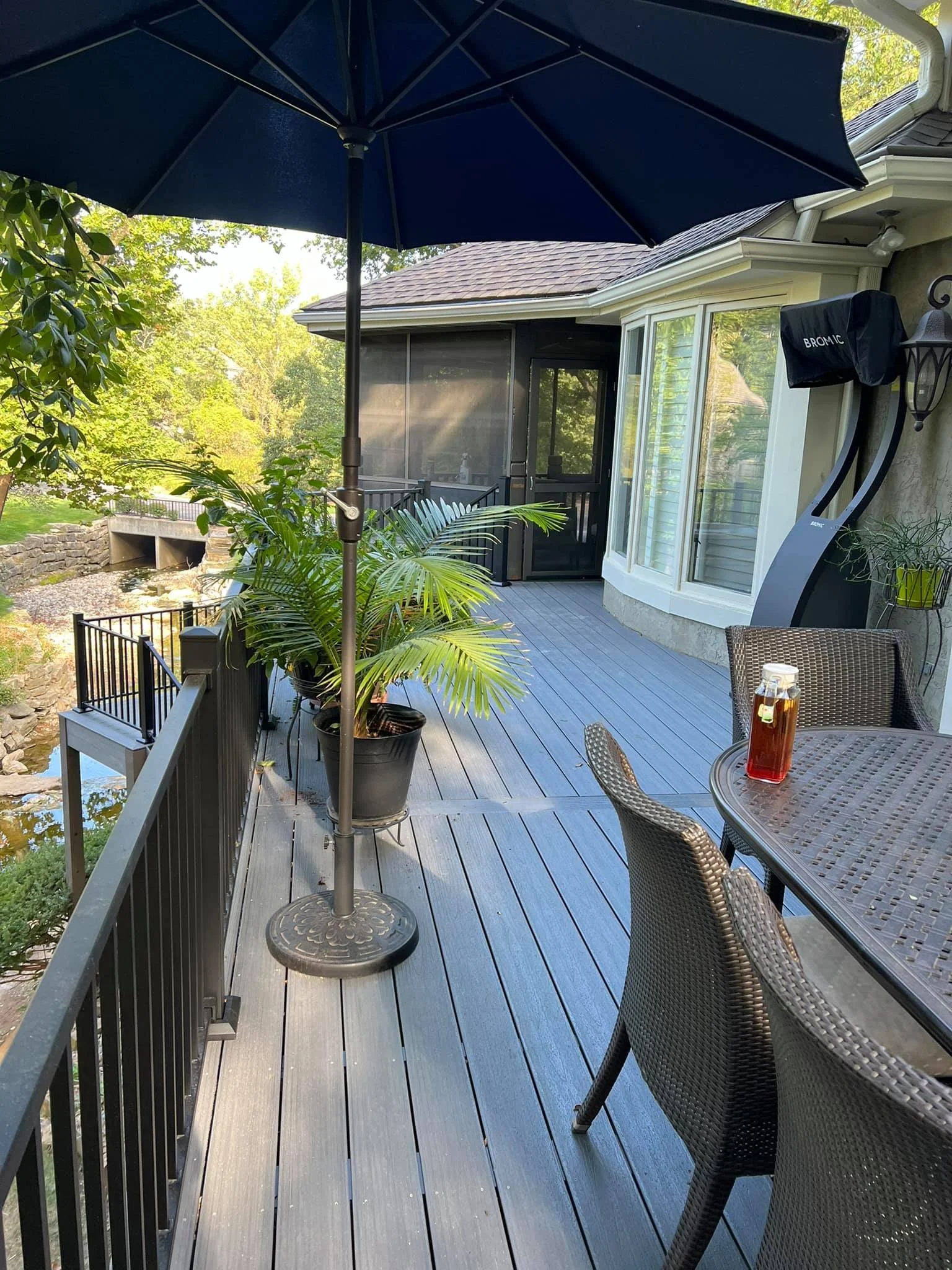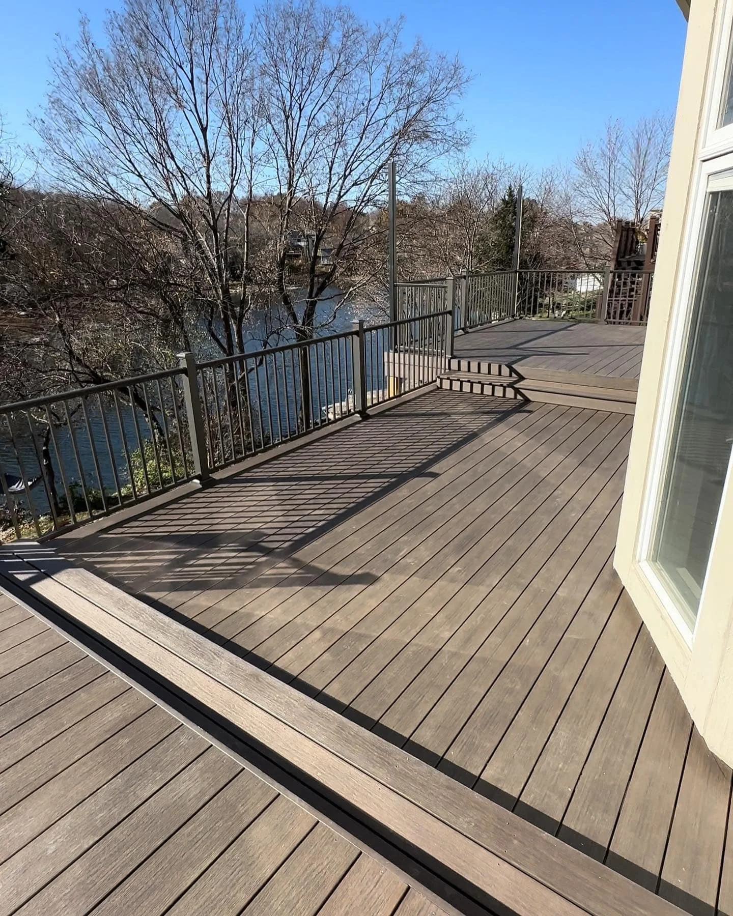 Wooden deck overlooking a river with trees and bare branches in the background, situated beside a house with a large window.  Dekco Construction Johnson County, Kansas