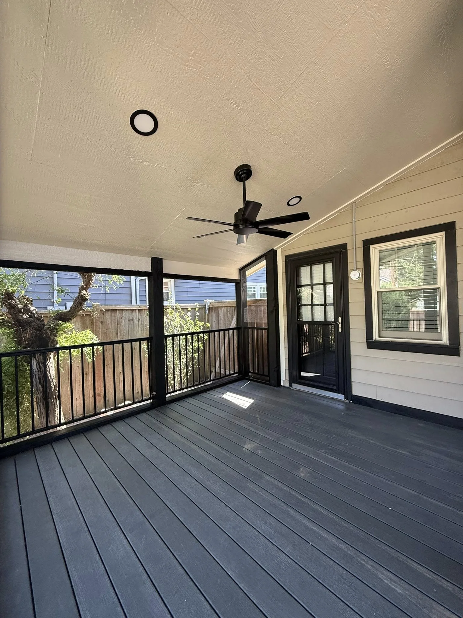 Covered outdoor patio with black railing, ceiling fan, door, and windows.