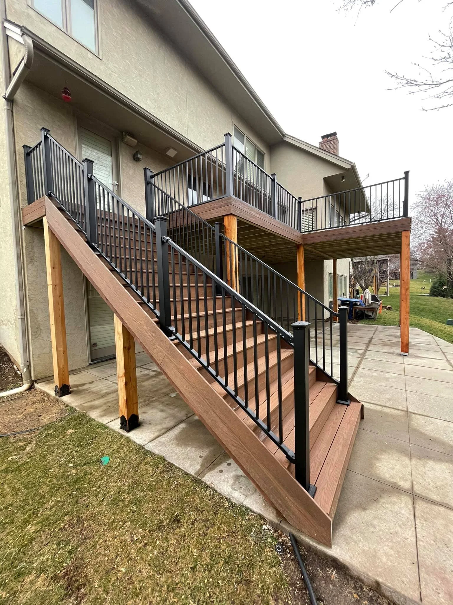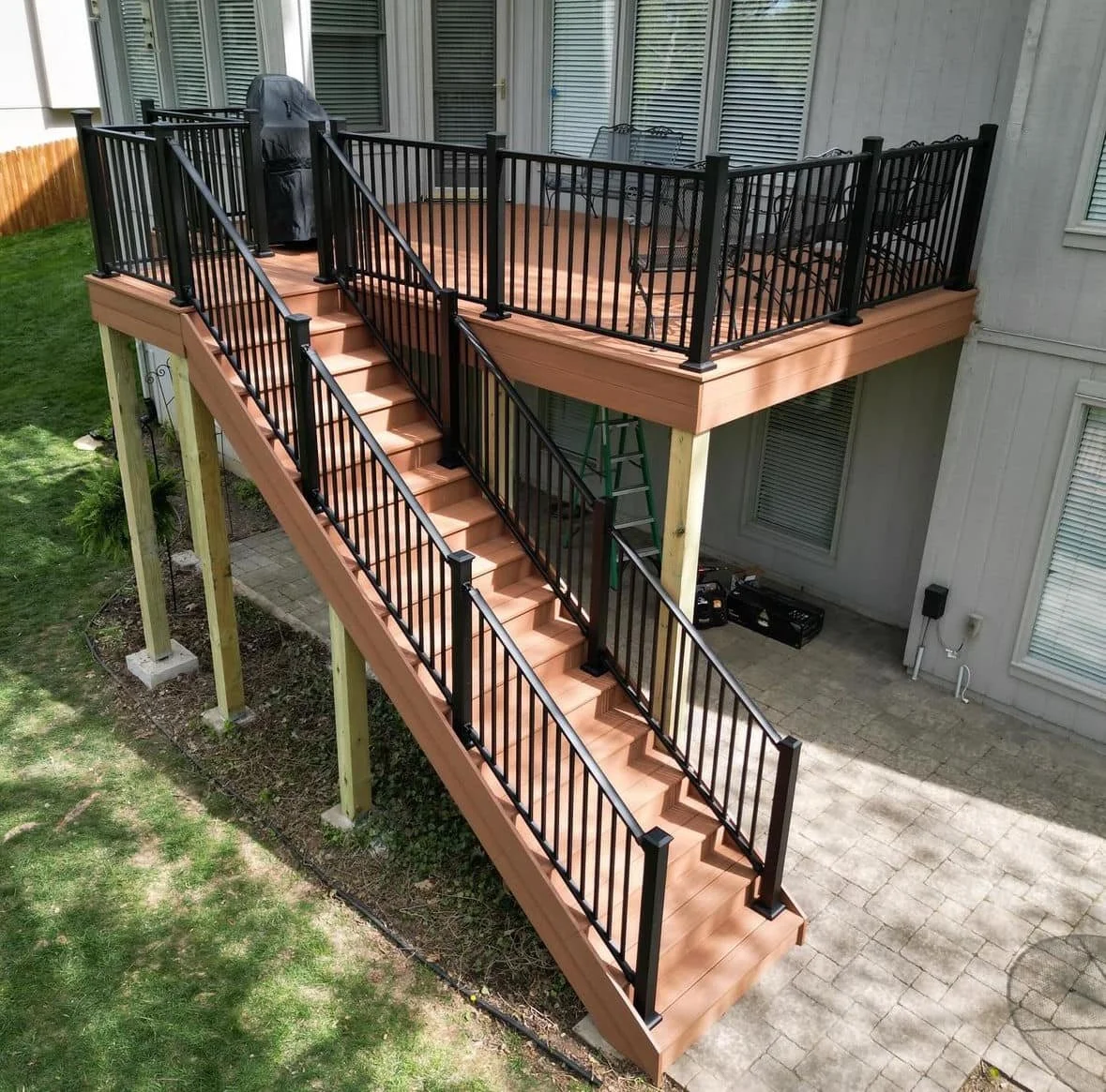 A newly constructed outdoor deck with stairs and black metal railings attached to the back of a house.