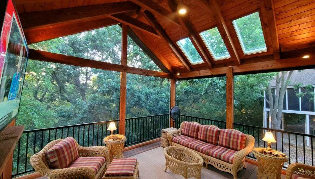 A screened-in porch with wooden ceiling and walls, featuring wicker furniture with plaid cushions, small tables with lamps, and skylights revealing trees outside.