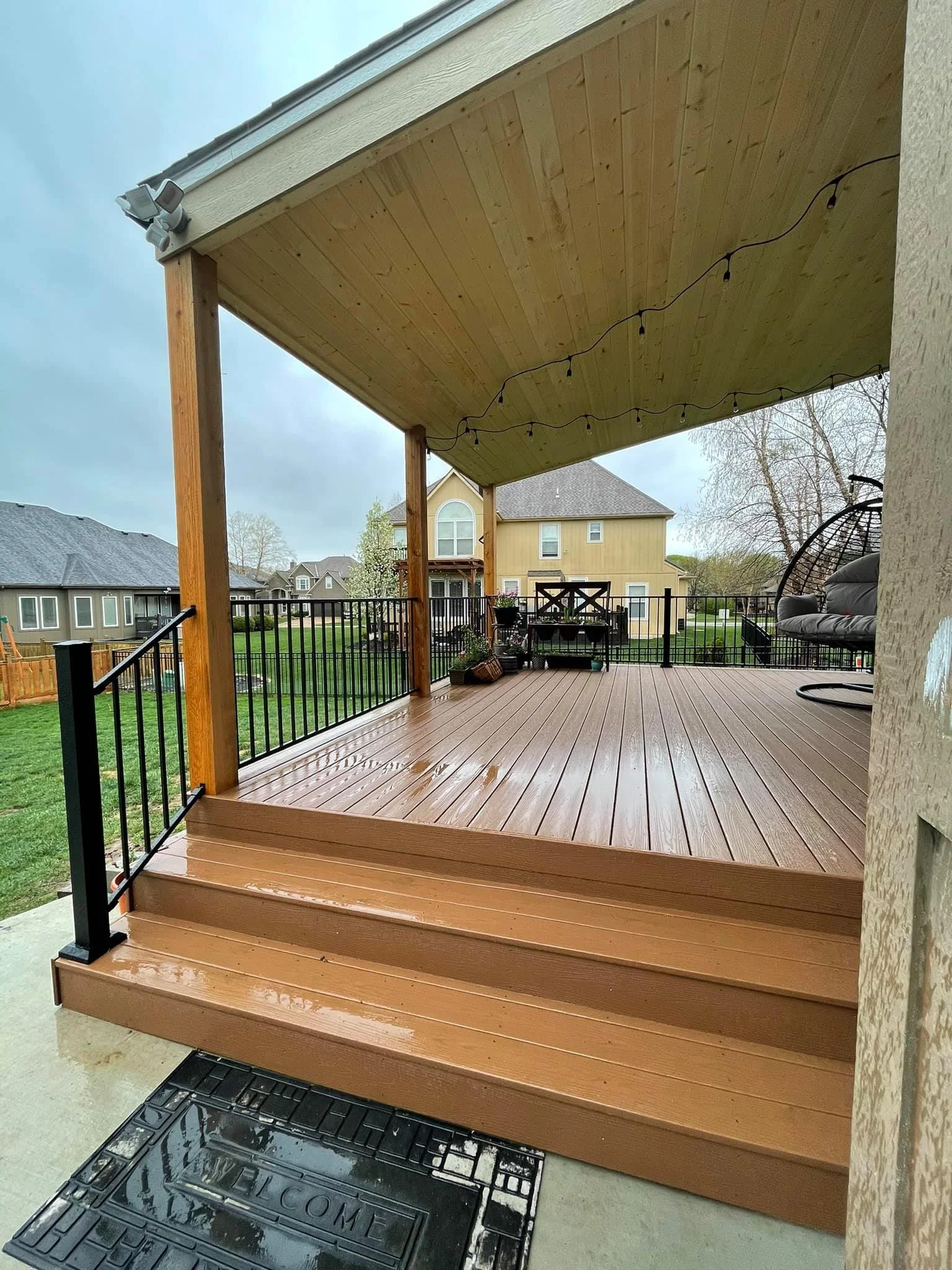 Newly built wooden deck with steps leading up to it, featuring a black welcome mat, black railing, and string lights hanging under a covered porch in a backyard with neighboring houses and trees.