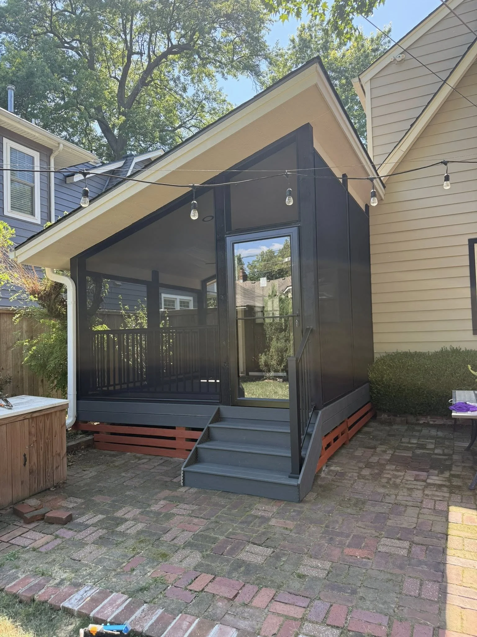 A screened-in porch with stairs leading up to a glass door, attached to a yellow house with vertical siding. The porch has black framing and is set on a brick patio, with string lights hanging above.