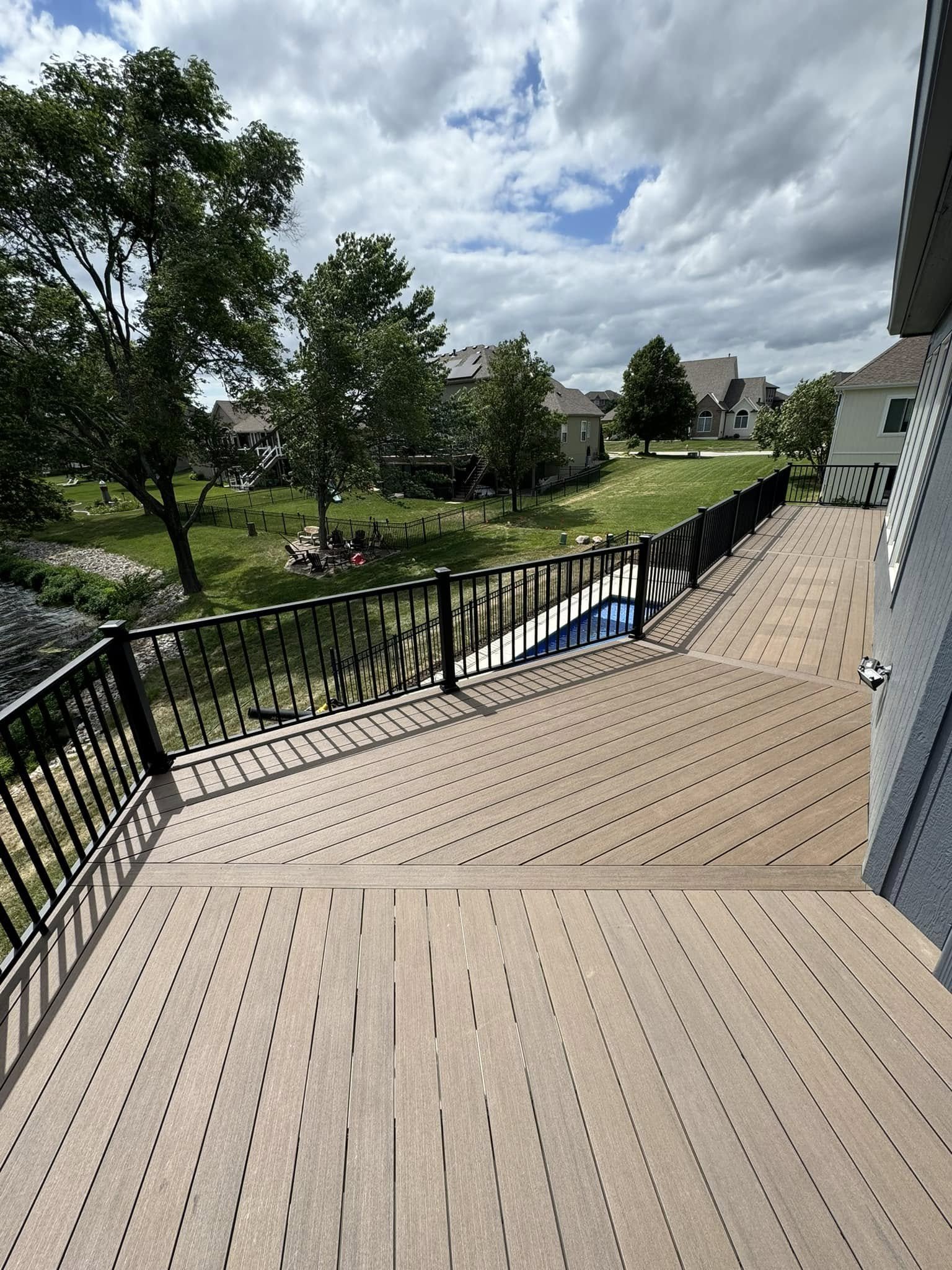 View of a backyard deck with light brown wooden flooring and black metal railing, overlooking a green backyard with trees, a small pool, and neighboring houses under a partly cloudy sky.  Dekco Construction Johnson County, Kansas
