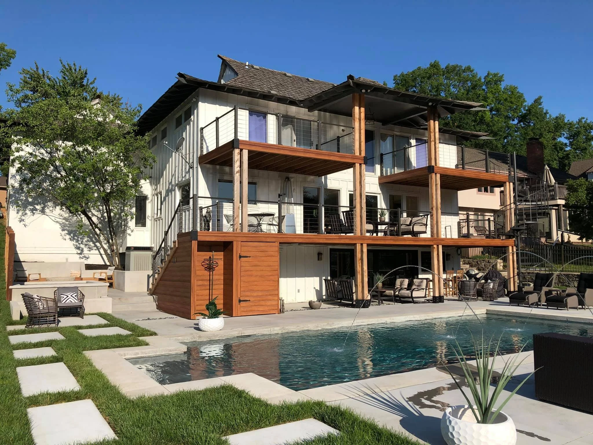 Back view of a multi-story house with outdoor balcony decks overlooking a swimming pool, with patio furniture and greenery.