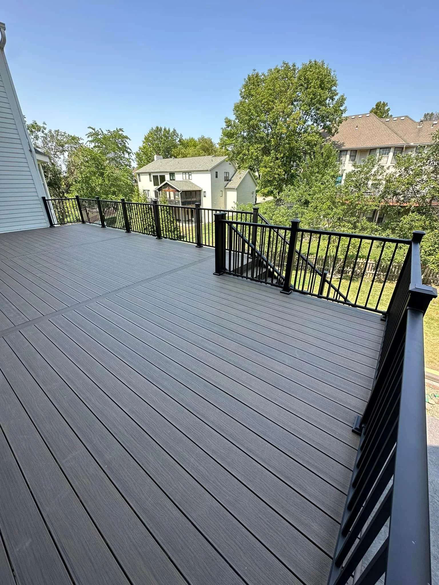 Empty outdoor backyard deck with black metal railing, overlooking neighboring houses and green trees under a clear blue sky.