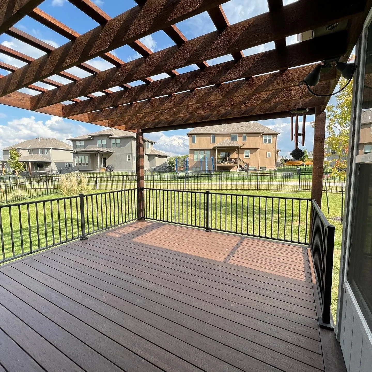 View of a backyard wooden deck with a wooden pergola overhead and a black metal railing surround. Houses and a green lawn are visible in the background, with a partly cloudy sky.