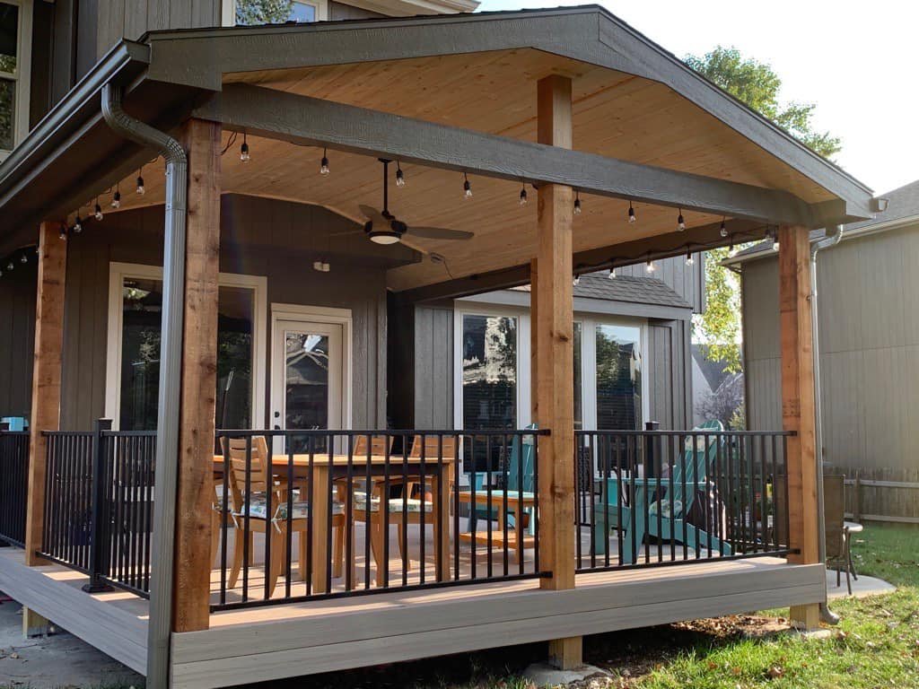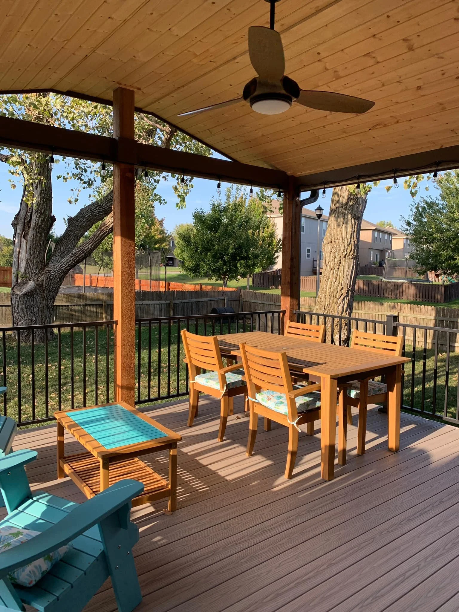 A backyard covered porch with a wooden floor, black railings, a ceiling fan, and string lights hanging from the ceiling. There are outdoor chairs and a dining table, as well as two turquoise lounge chairs.  Dekco Construction Johnson County, Kansas