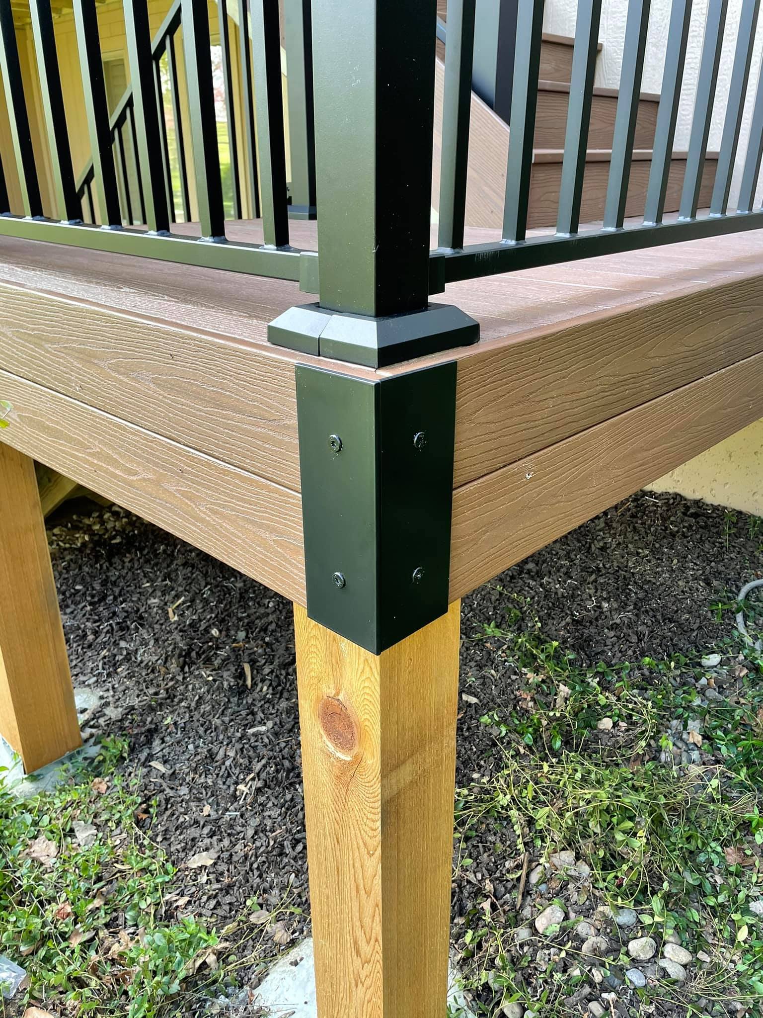 Close-up of a wooden deck railing with black metal balusters and a black metal post cap, supported by a wooden post surrounded by soil and small plants.