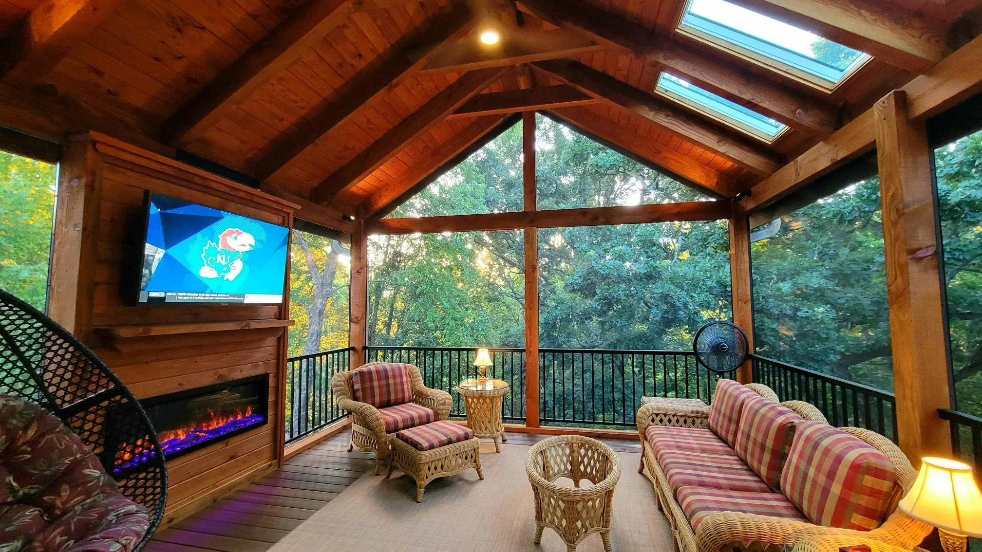 A screened-in porch or sunroom with wooden walls and ceiling, decorated with wicker furniture including a sofa, chairs, and a small table with lamps. A wall-mounted television displays the Kansas Jayhawks logo. Large windows and skylights let in natu