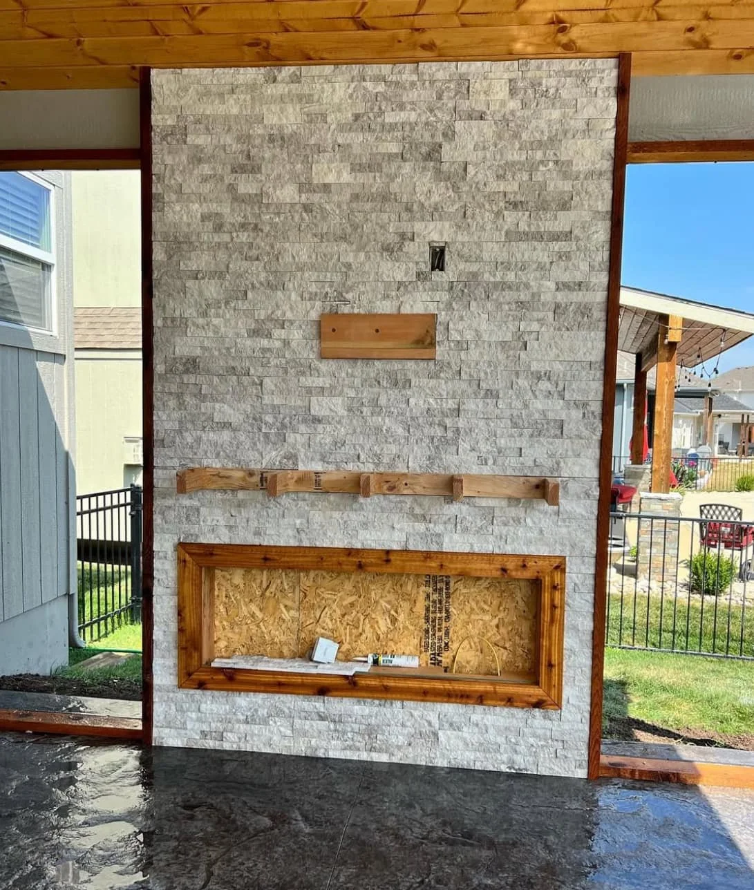 A partially built outdoor fireplace with a stone wall, wooden trim, and uninstalled mantel, situated on a concrete patio in a backyard neighborhood.