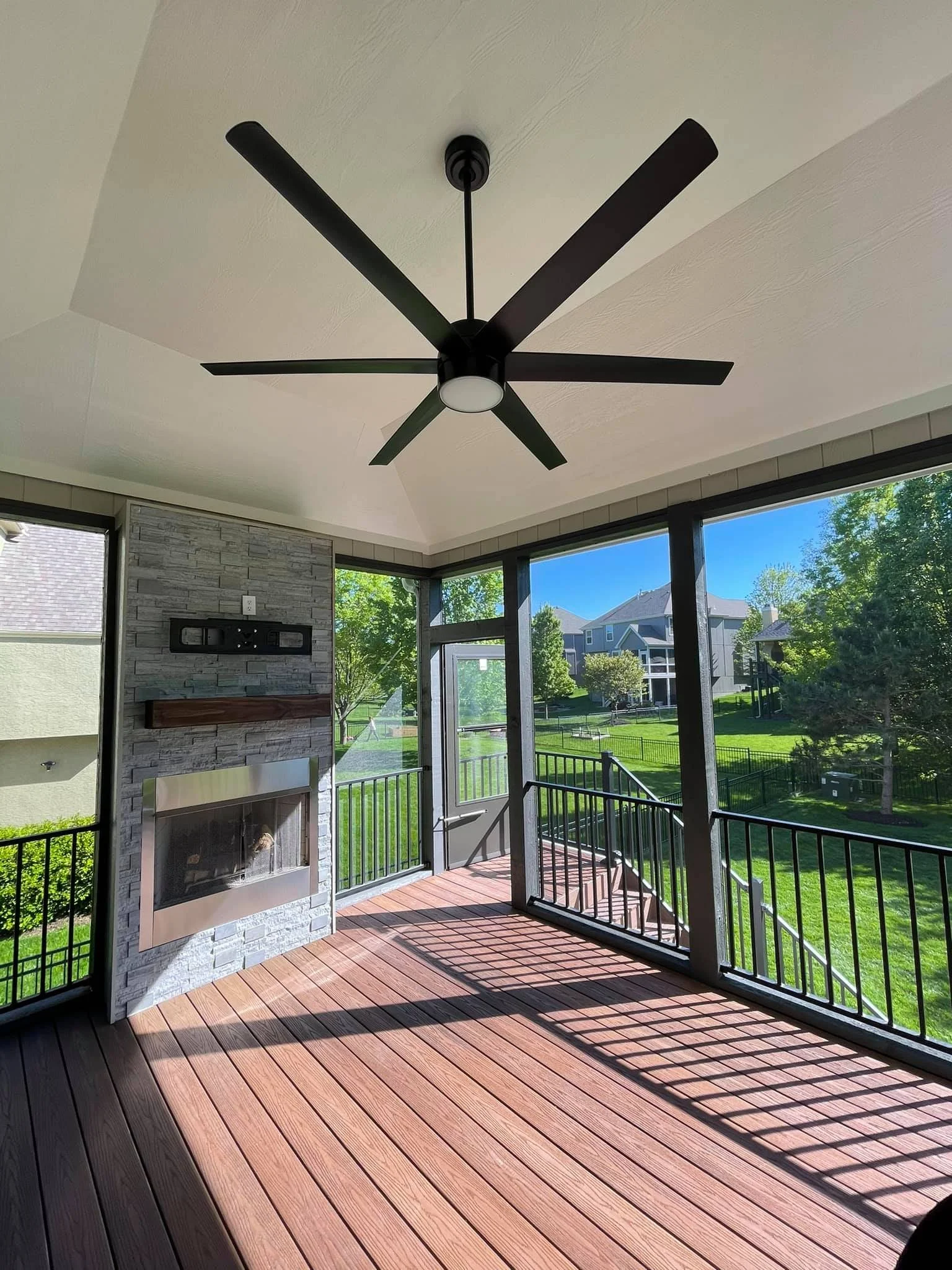 Porch enclosed with screened panels, featuring a ceiling fan, a gas fireplace, and a view of a residential neighborhood with trees and houses.