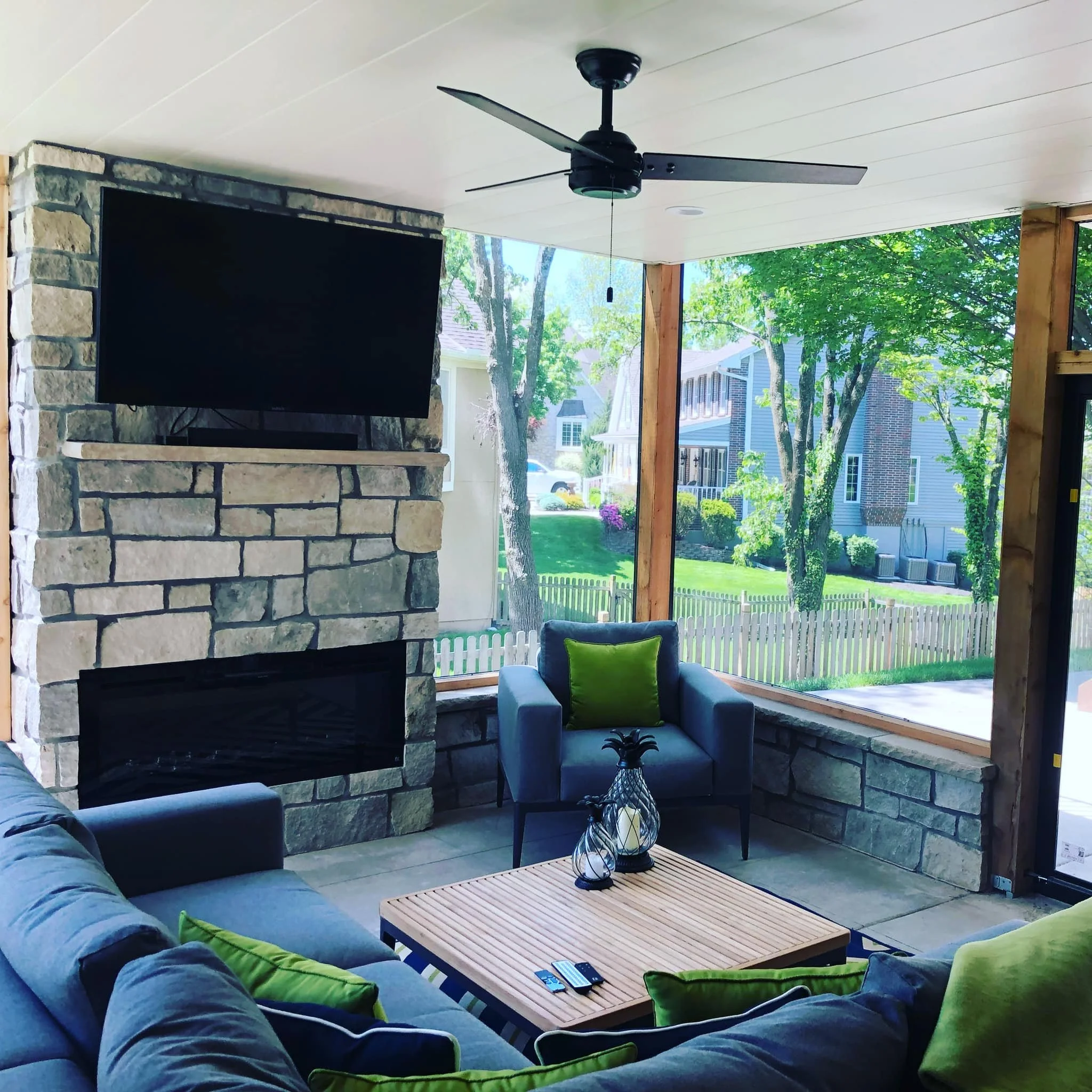 Sunlit enclosed porch with stone fireplace, wall-mounted TV, ceiling fan, and outdoor furniture including a blue armchair and a sofa with green pillows, overlooking a residential neighborhood with trees and houses.