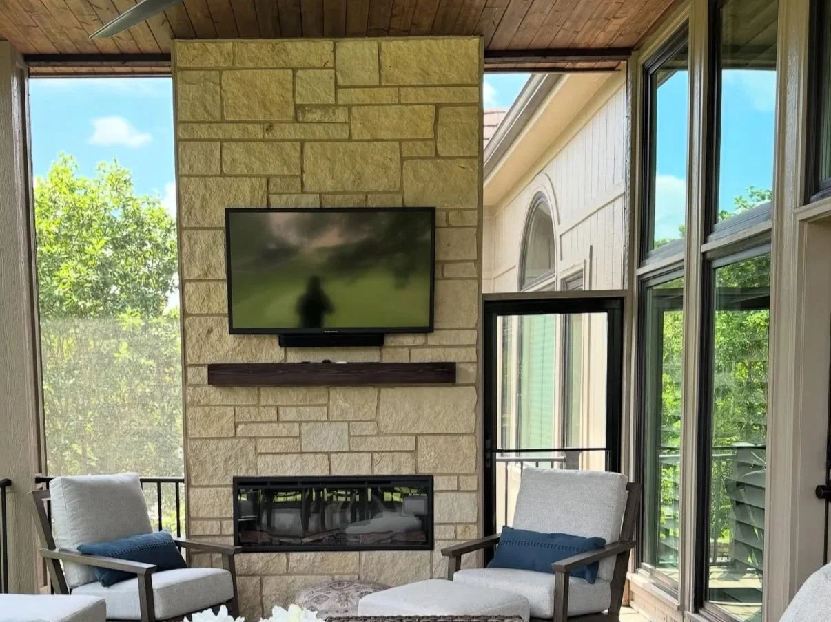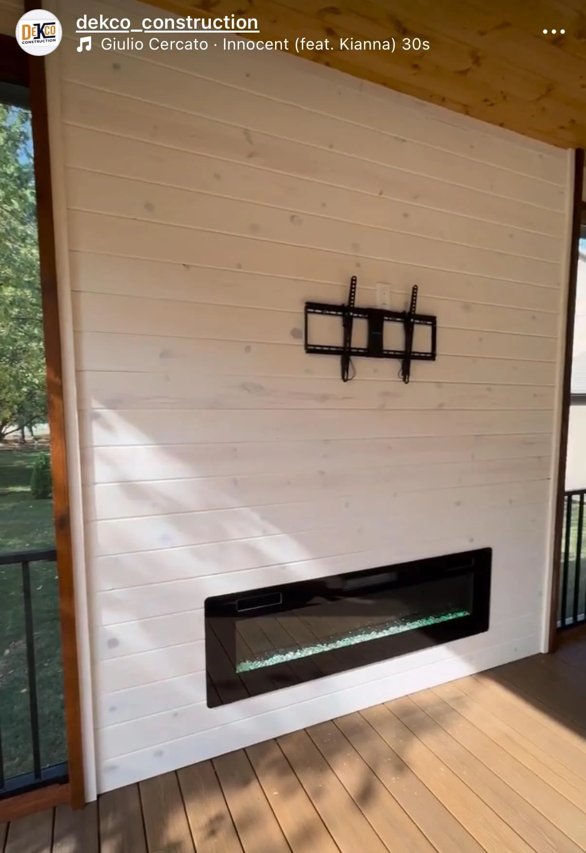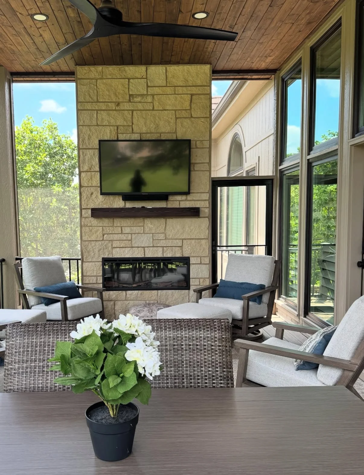 A TV mounted above a modern electric fireplace on a wood-paneled wall on a screened porch, showcasing family watching TV. Outside view of a backyard with trees and grass seen through the screened windows.