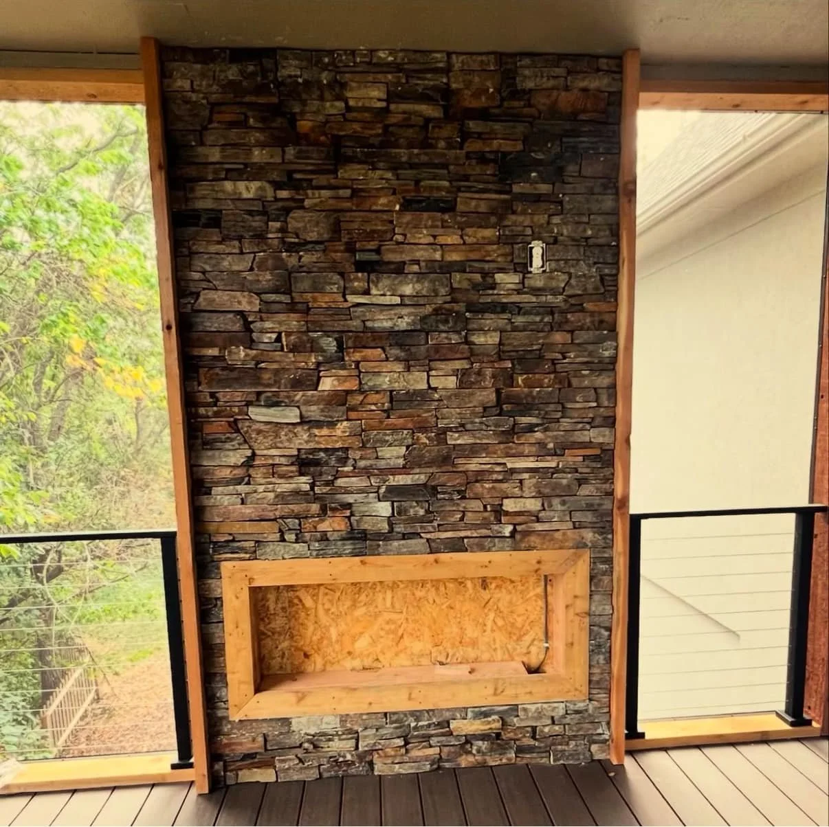 Interior view of a stone accent wall with a rectangular fireplace opening framed in wood, flanked by glass siding and metal railings, with green trees visible outdoors.