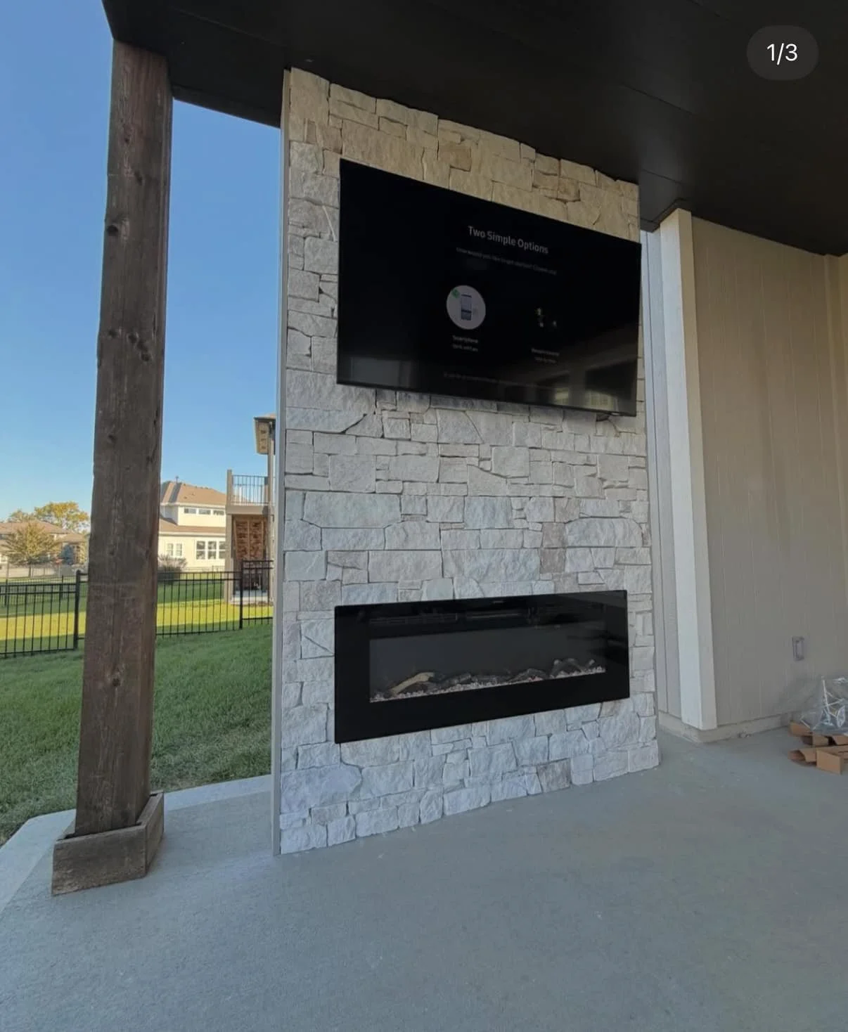 Outdoor living area with a stone fireplace and a mounted flat screen TV on a stone wall, with a view of a grassy yard and neighboring houses in the background.